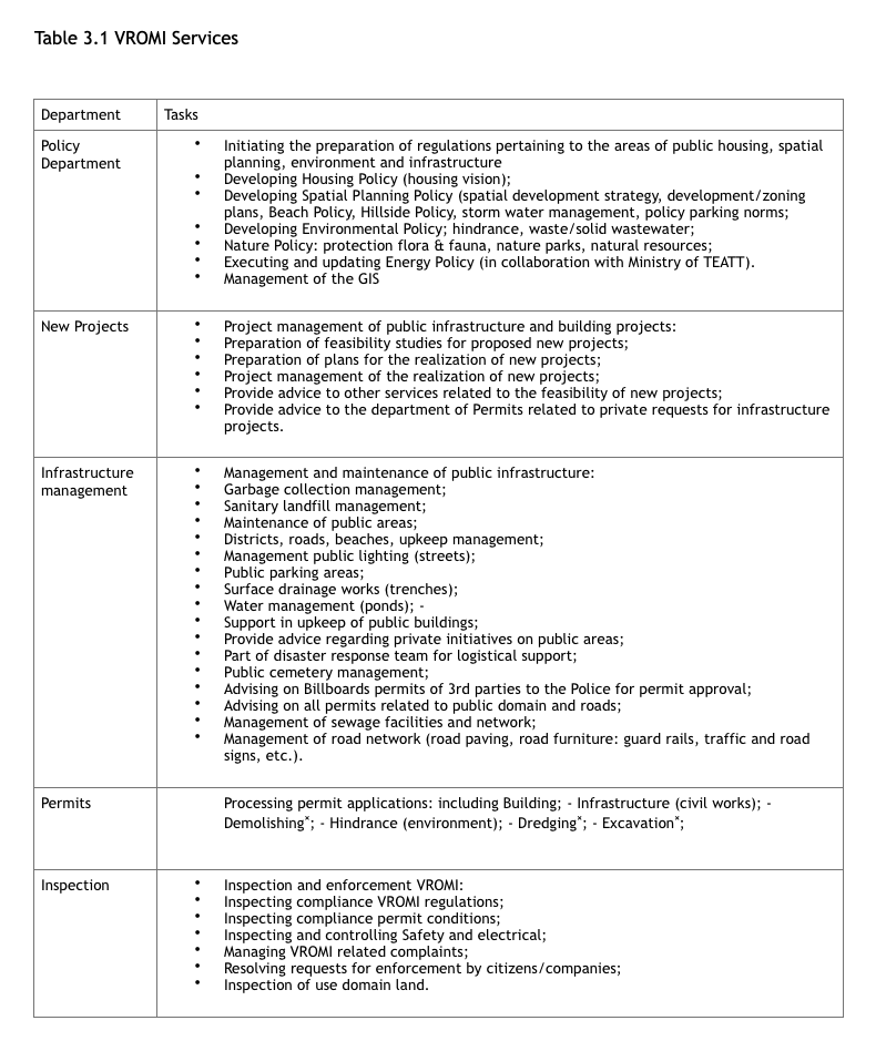 The overall management, administration and monitoring of environment and social issues of Sint Maarten is assigned to two main Ministries: Ministry of Public Health, Housing, Spatial Planning, Environment and Infrastructure (VROMI,) and the Ministry of Public Health, Social Development and Labor (VSA). The VROMI is the most prominent institution having its hands in environmental matters related to policies, development planning, infrastructure management, and permitting and inspection and enforcement. The roles and associated tasks for each VROMI department are listed in table 3.1. VROMI Services