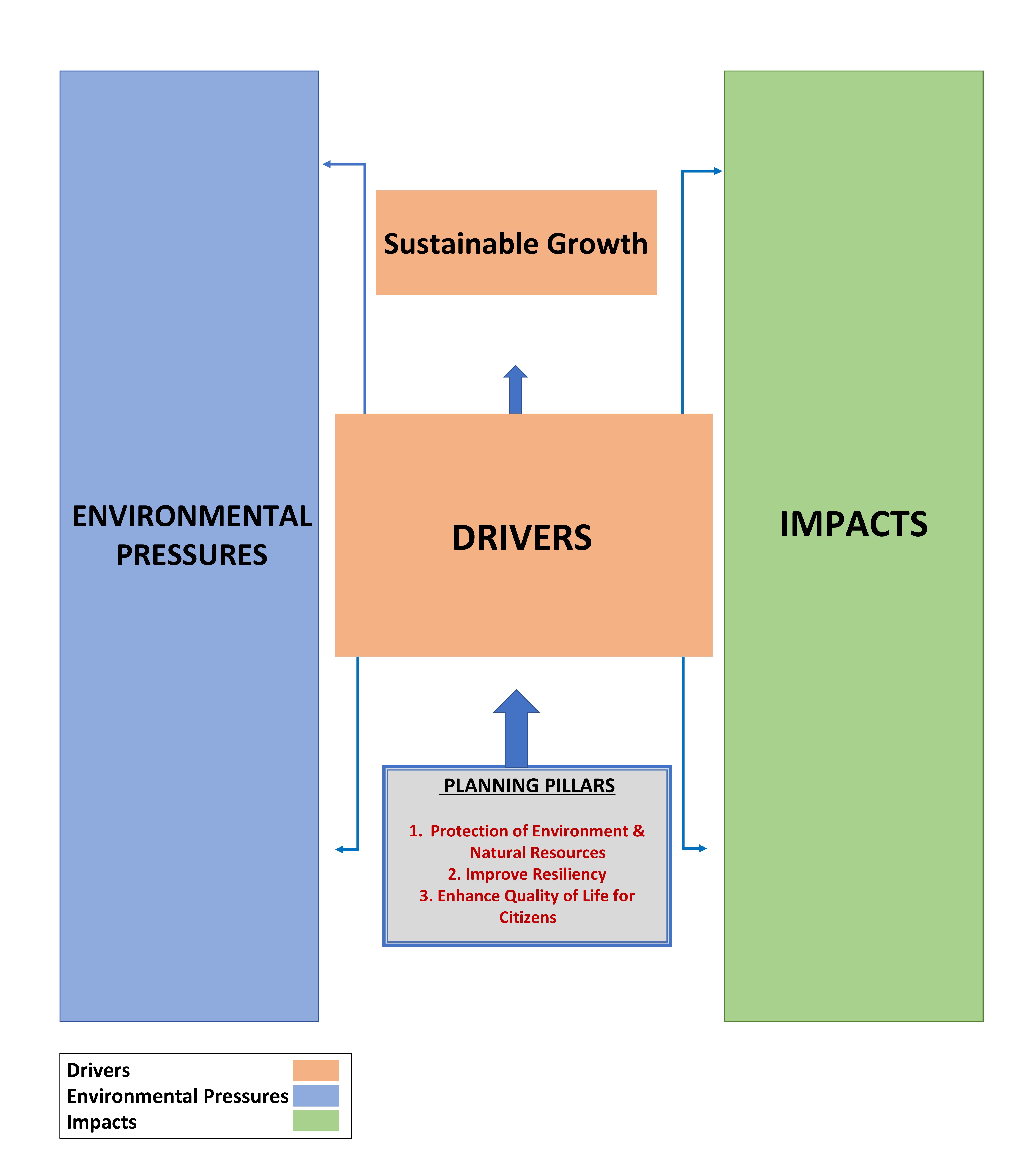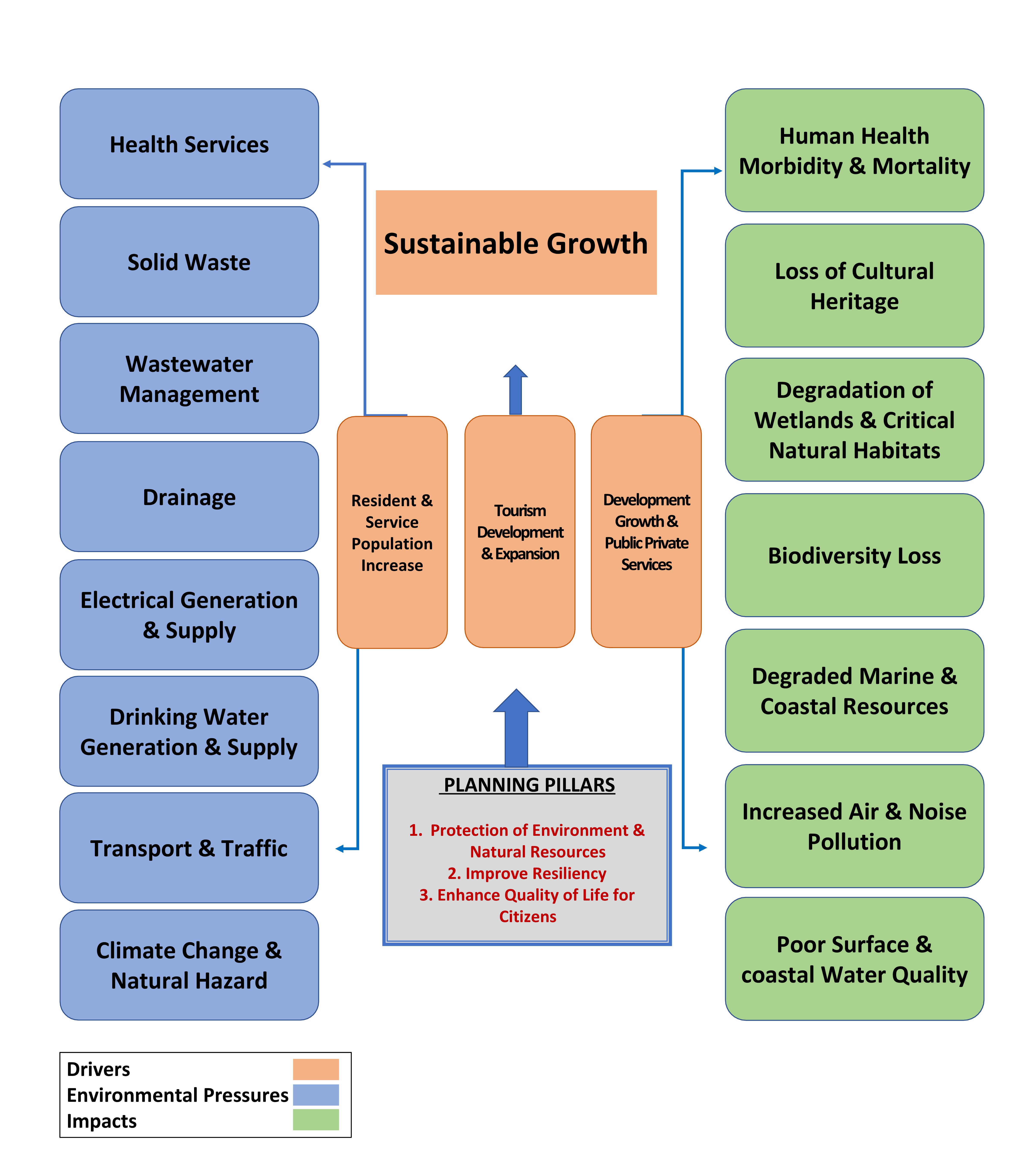 Main environmental concerns for the island are based on activities related to 1) health services, 2) solid waste, 3) wastewater management, 4) flooding and drainage, 5) electrical generation and supply, 6) drinking water generation and supply, 7) transport and traffic, and 8) climate change and natural hazards. The e-Book includes separate sections (hyperlinks are provided) for these environmental pressures to discuss the current situations and how they create environmental impacts on the island. These activities create environmental pressures on drivers of the sustainable growth. The Sint Maarten e-CEA focuses on three drivers which are 1) resident and service population increase, 2) tourism development and expansion, and 3) development growth and public and private services. While Sint Maarten is growing based on these drivers, there are impacts on several sectors which are listed in the Figure 1 which presents the key themes and sectors of the Sint Maarten e-CEA.