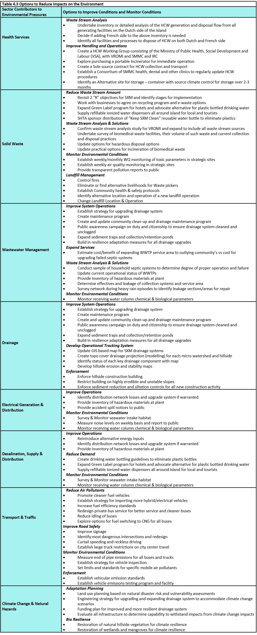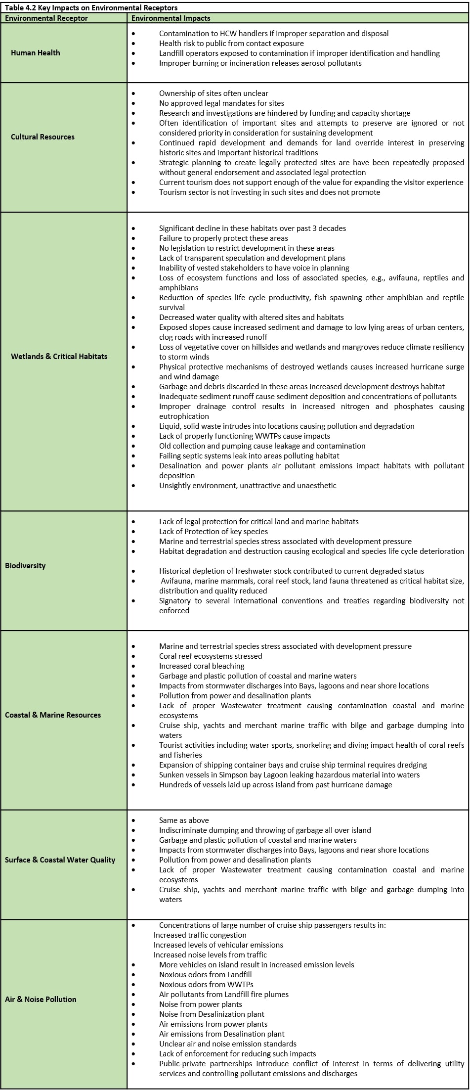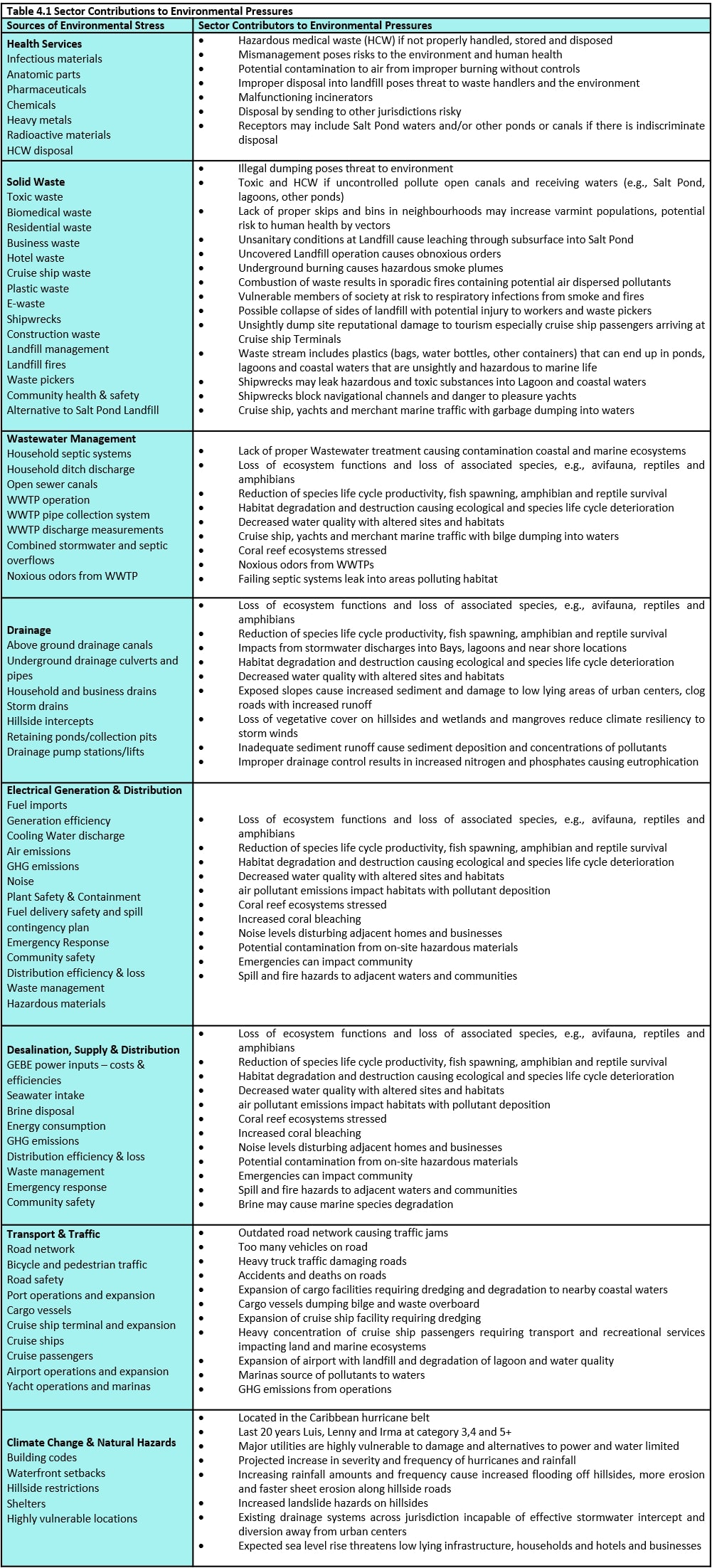 Appreciation of the multiple factors contributing to the growth of the economy, maintenance of the islands environment and natural resources (ENR) and well-being of the people of Sint Maarten are summed up figure 4.1. Major ENR pressures are associated with numerous public and private services (e.g., health services, solid waste management, wastewater management, electrical and drinking water supply) that collectively have both positive and negative impacts on the ENR. Continuing development growth requires maintaining and/or expanding these services. Additional sources of impacts are attributable to other essential infrastructure services such as the stormwater drainage system. The transport system is taxed to accommodate increasing traffic and the periodic heavy concentrations of tourists when there are extremely large capacity or multiple arrivals of cruise ships. These contributors are pictured in blue on the left side of the figure.