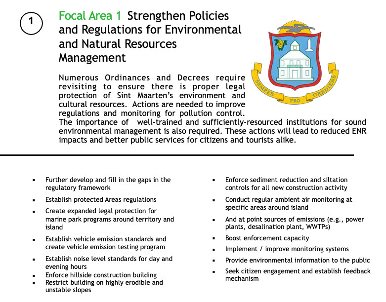 Five Focal Areas are promoted for Sint Maarten based on the drivers and environmental challenges discussed in this CEA. The first Focus Area considers the need to improve governance for environment, natural resources and sustainability and well-being of its citizens. This Focal Area represents a collective opportunity around the policies and regulations that have been pending and or have been recognized to be important and need to be promulgated in the near future.