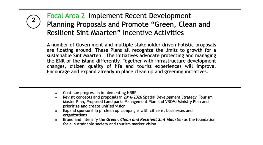 The second Focal Area acknowledges that a number of past development planning initiatives have been promoted by various stakeholders. Most of these spatial, land use and development plans accept that there are limits to uncontrolled development on the island and sustainable development is widely recognized. Different themes and target sectors are analyzed many drawing a direct link to protection and management of the ENR of Sint Maarten.