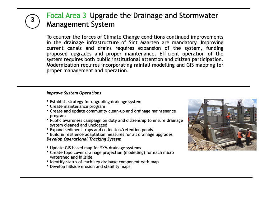 The impacts of Climate Change continue to overload the drainage infrastructure of Sint Maarten from both fluvial events and sea level rise. Improvements such as expanding current canals and drains, funding proposed upgrades and proper maintenance. Efficient operation of the system requires both public institutional attention and citizen participation. Common practice to improve management of this infrastructure incorporates rainfall modelling and GIS mapping to identify locations constantly flooding, areas that need mitigation to reduce erosion, sediment loading and flash flooding. These issues are addressed under Focal Area 3.
