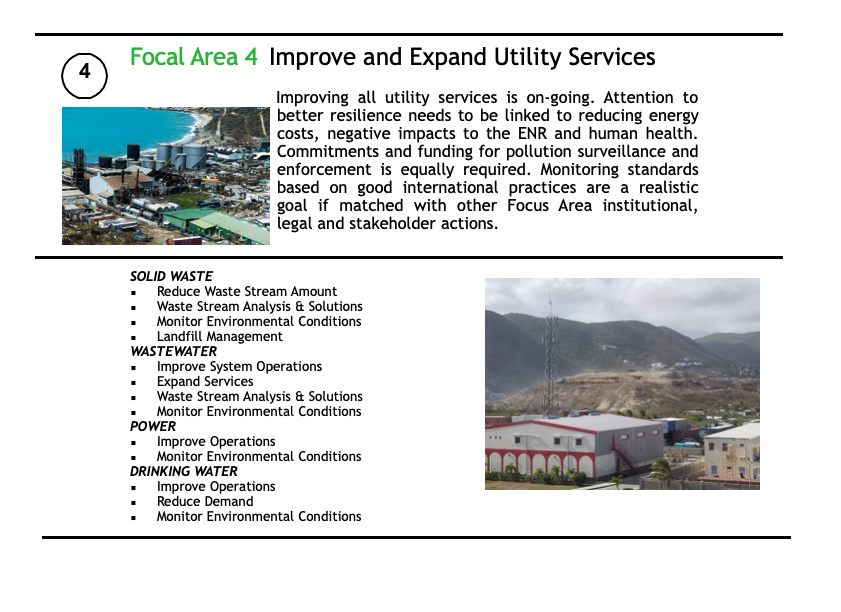 Focal Area 4 addresses the challenges and opportunities across the utility sector. The provision of utility services in Sint Maarten from GEBE power and the desalinization plant are highly reliable. Treating wastewater remains a challenge and efforts at improving services with upgrading WWTPs and expanding such service has been a high priority matter for years. Solid waste and the concerns around HCW management continue to be problematic. Challenges include better resilience needs to be linked to reducing energy costs, negative impacts to the ENR and human health. Commitments and funding for pollution surveillance and enforcement is equally required. Establishing monitoring standards and surveillance would provide essential information on air and water quality.