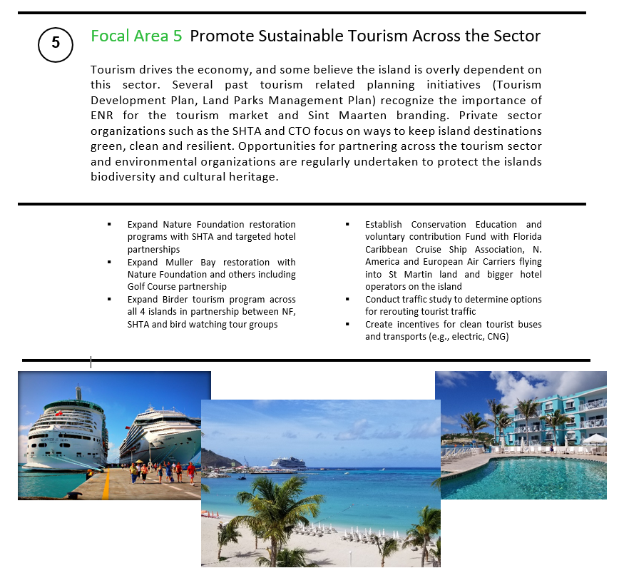Tourism drives the economy, and some believe the island is overly dependent on this sector. Focal Area 5 promotes sustainable tourism across the wider sector and stakeholders. The Focal Area features several past tourism related planning initiatives (Tourism Development Plan, Land Parks Management Plan) that recognize the importance of ENR for the tourism market and Sint Maarten branding. Private sector organizations such as the SHTA and CTO focus on ways to keep island destinations green, clean and resilient. Opportunities for partnering across the tourism sector and environmental organizations are regularly undertaken to protect the islands biodiversity and cultural heritage.