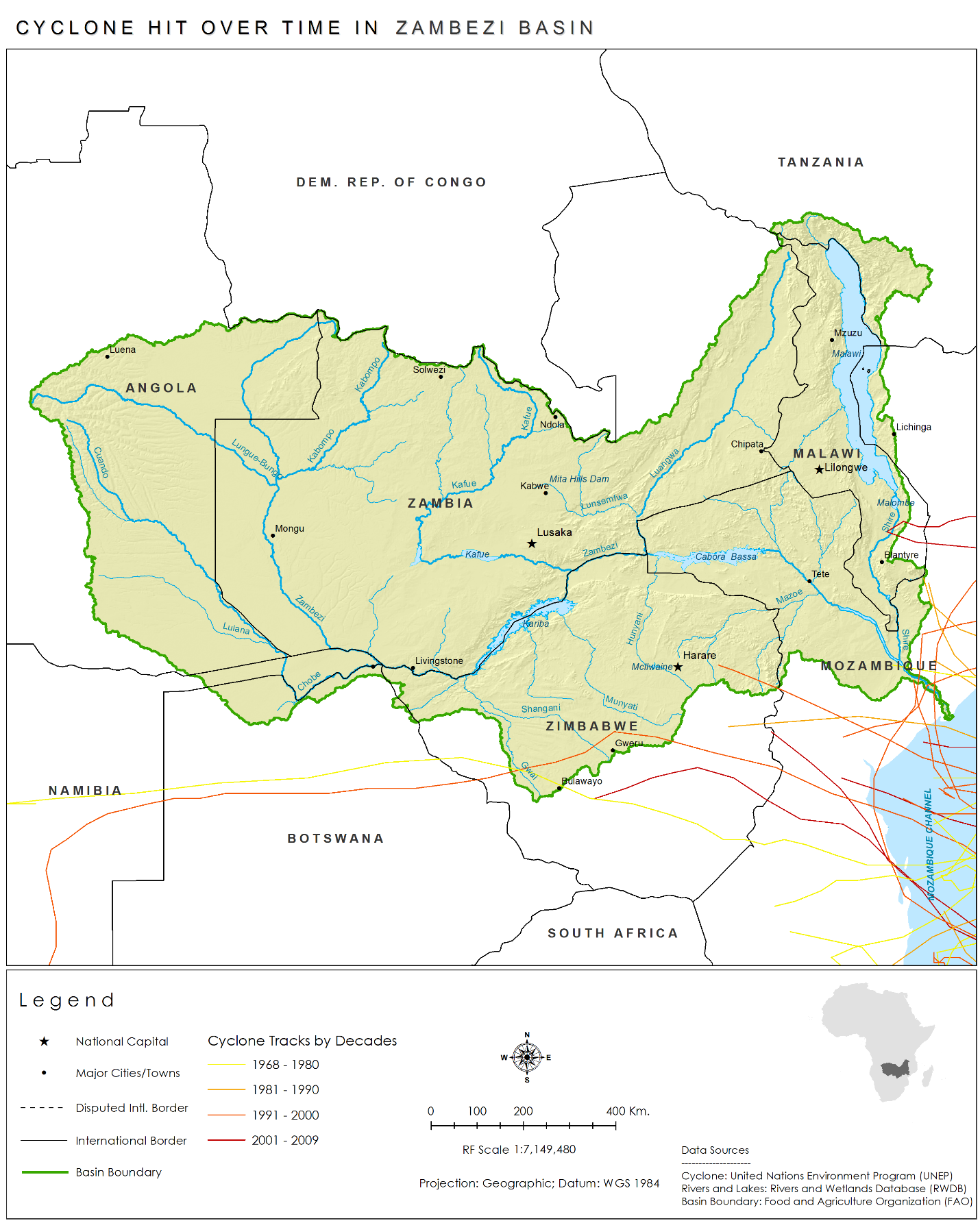 Cyclone tracks by decade in the Zambezi Basin.