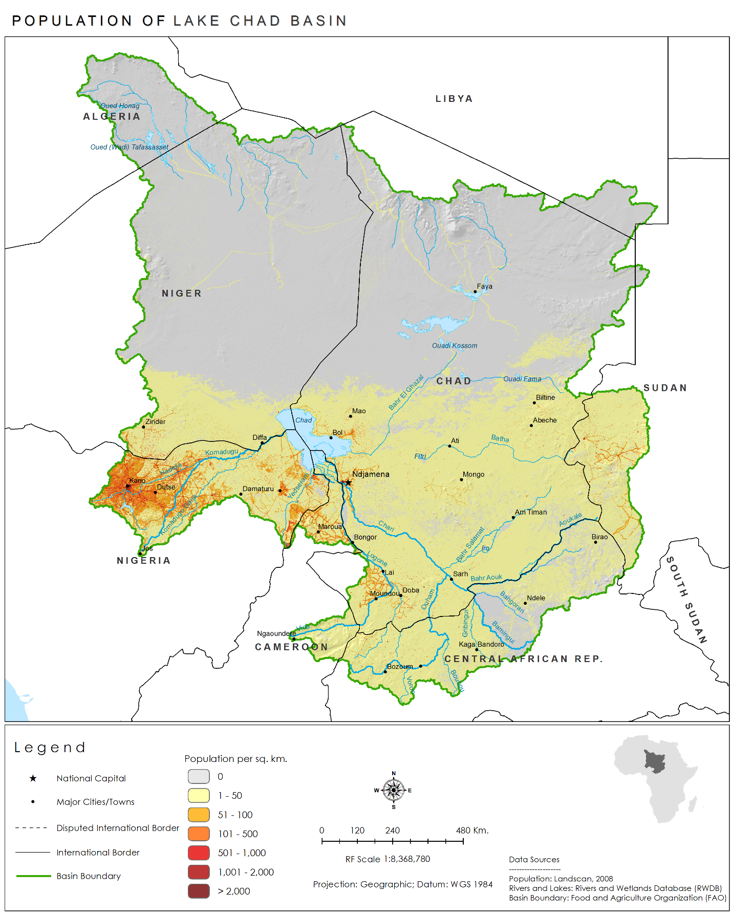 Population density within the Lake Chad basin is relatively low, with the exception of urban areas in Nigeria.