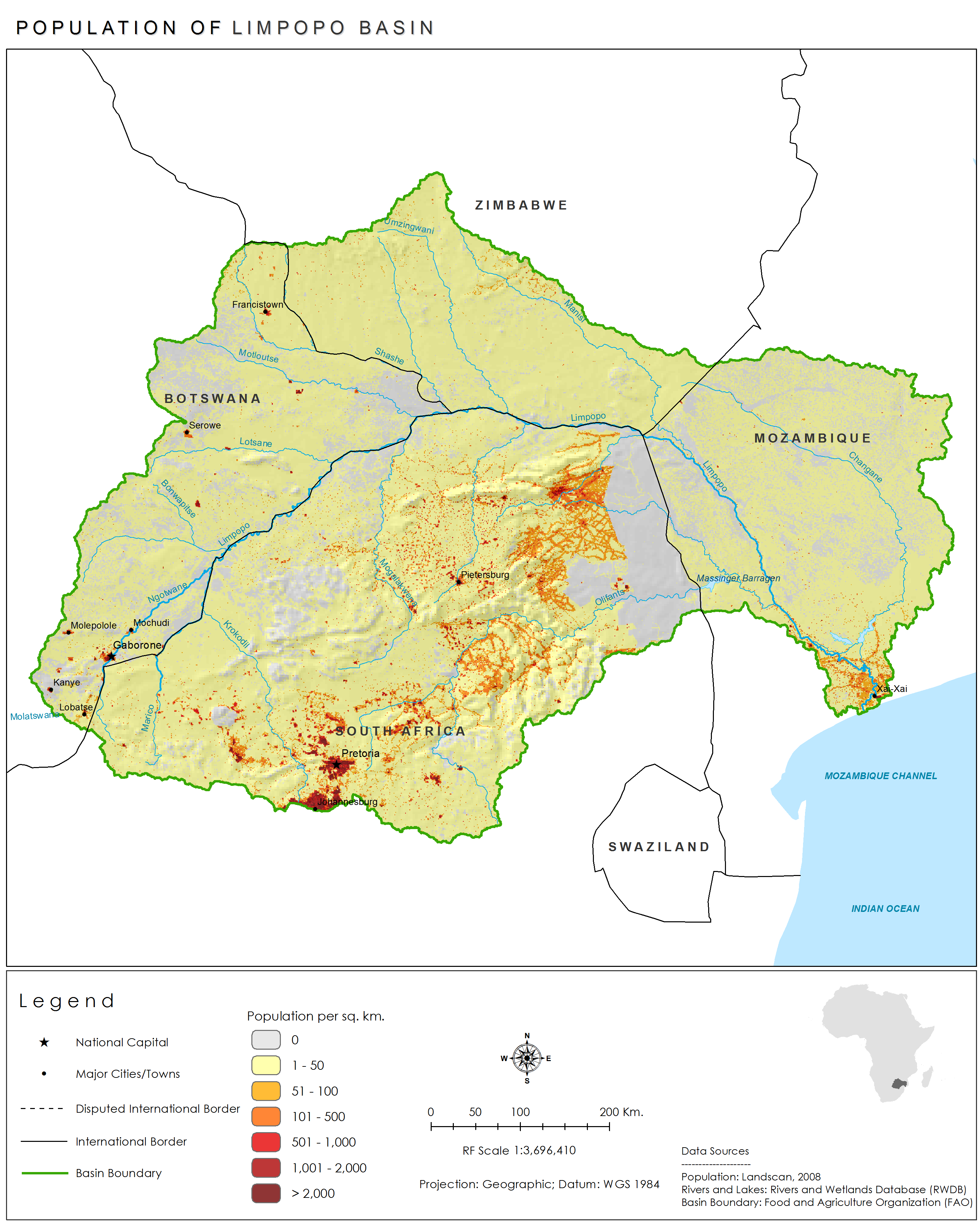 Population density in the Limpopo Basin is highest around the urban areas of Pretoria and Johannesburg in South Africa.