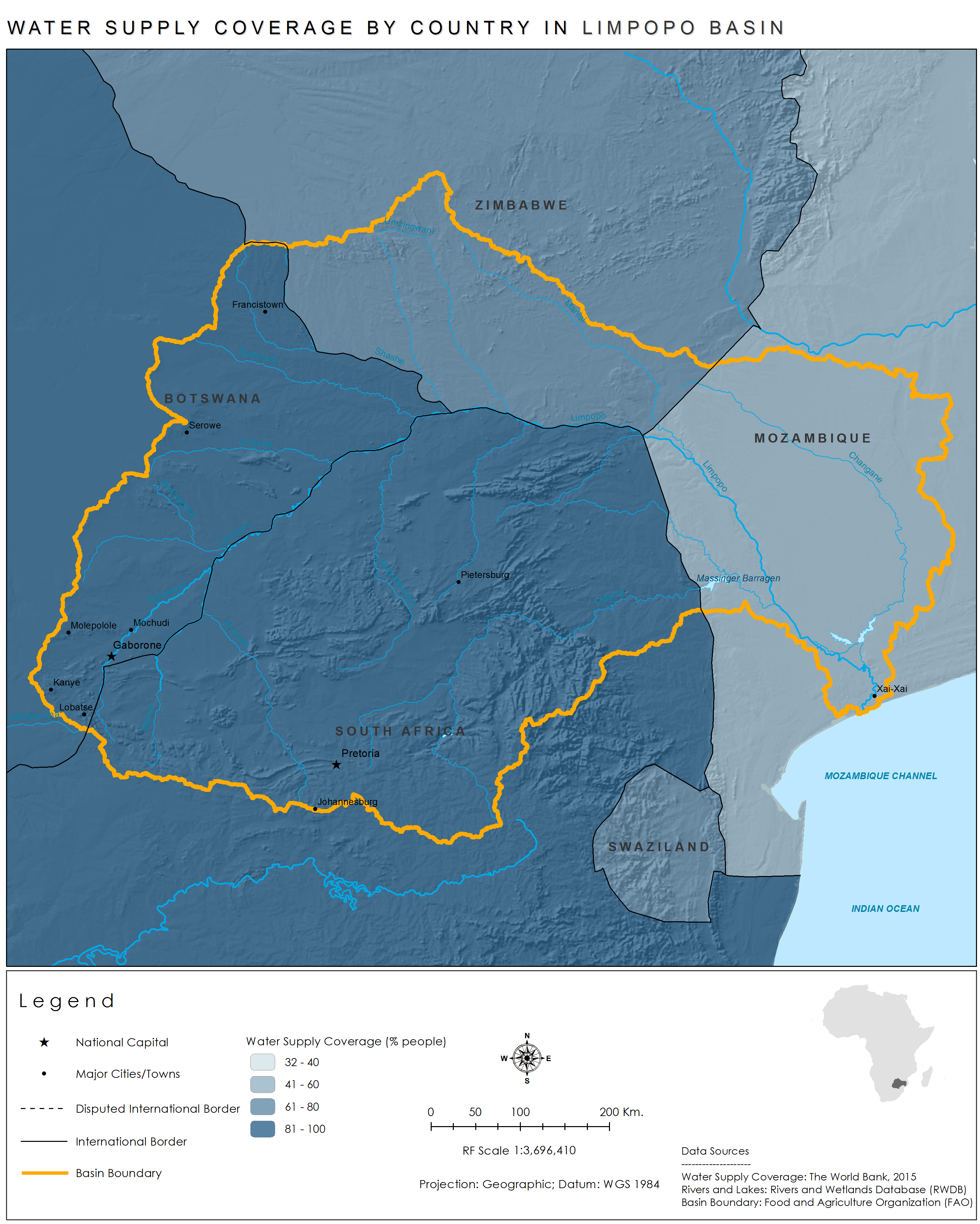 Water supply coverage is higher in Botswana and South Africa than in Mozambique, which has a much lower percentage of people with water supply coverage.