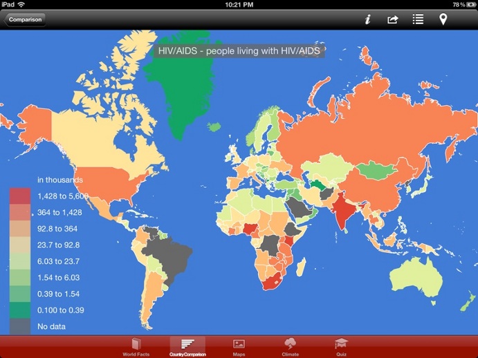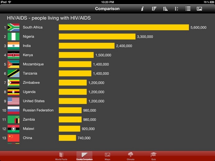 All statistics from the fact book is visualized with interactive charts and maps. Select the Country Comparison tab from the tabbar to access the country comparison page. Scroll the chart to see all countries. You can sort the data in ascending or descending or alphabetic order by tapping on the corresponding sort icons in the toolbar. Switch to other indicators by selecting them with the 'Table of contents' icon in the toolbar. Tapping on the 'Map' icon will bring you to the geographic representation of the same data.