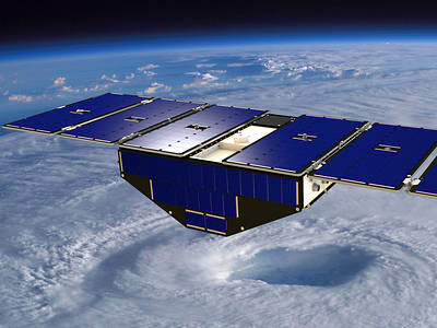 Artist's concept of one of the eight Cyclone Global Navigation Satellite System satellites deployed in space above a hurricane.