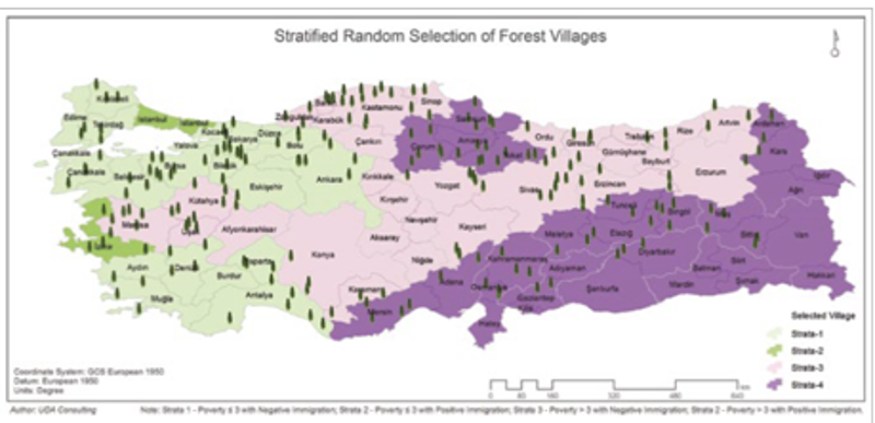 Methodologically, the sample design of the survey followed a two-stage stratification method. In the first stage, 203 villages were selected based on poverty and net migration rates. In the second stage, 2000 households were randomly selected. Policy simulations were also employed by the study. Household level information, including socio-demographic information, income generating activities, information on access to forest resources, and support from cooperatives, was collected using household modules. A village module was also administered to collect village level information, such as access to infrastructure and forest resources, and forest village development programs.