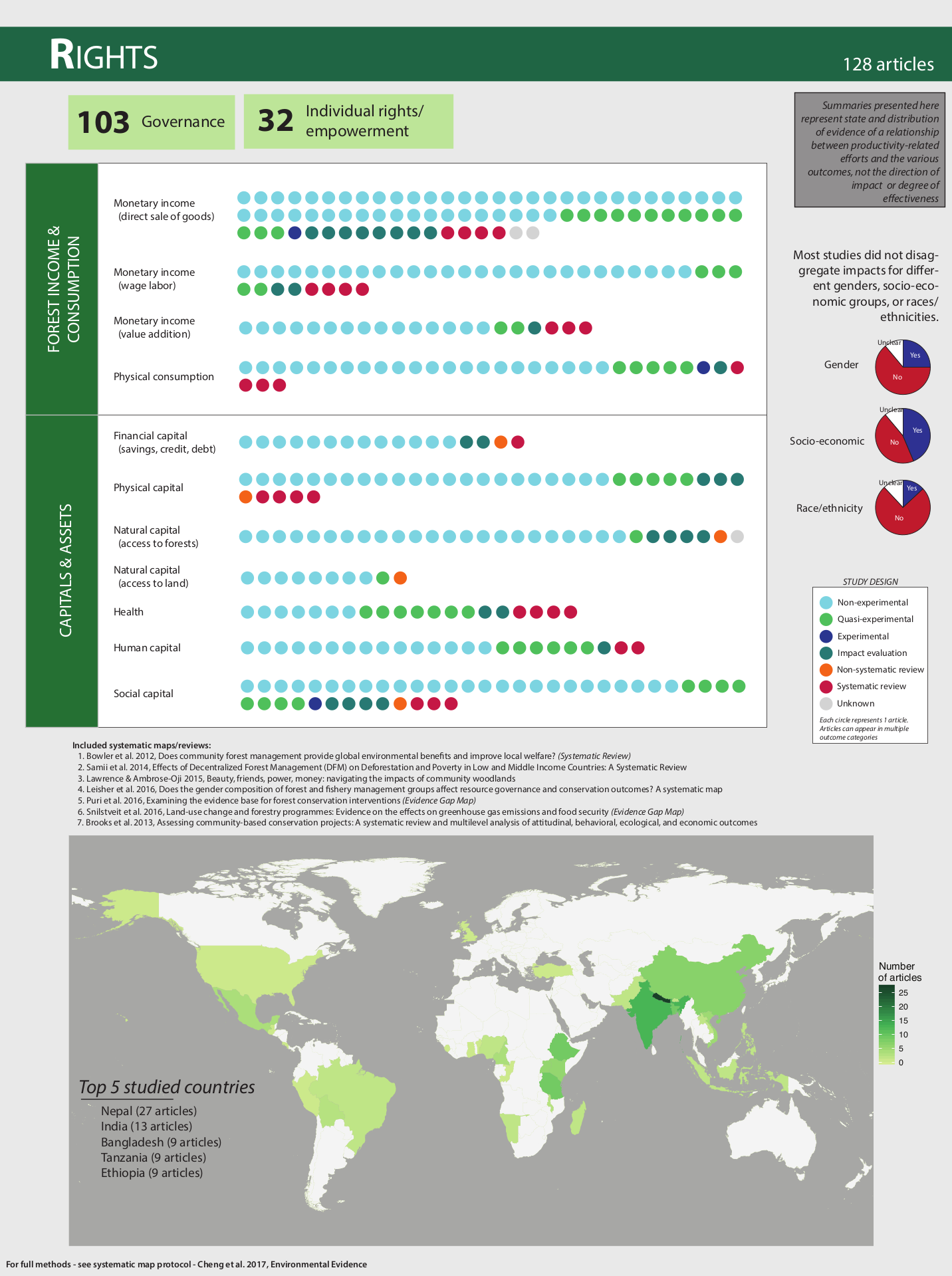 Our knowledge assessment reports that governance, and individual rights and empowerment are the most investigated topics when studying the synergies between forest and poverty outcomes. 128 articles out of the 242 focused on the actions to strength formal and/or informal rights and responsibilities of forest-dependent communities and forest managers such as governance (policies, laws and structures along with monitoring, enforcement, and compliance structures) and individual rights/empowerment (property rights, access, participation at local levels). This assessment highlighted a bulk of evidence on the links between these actions and monetary income through direct sales of forest goods, and social capital.
