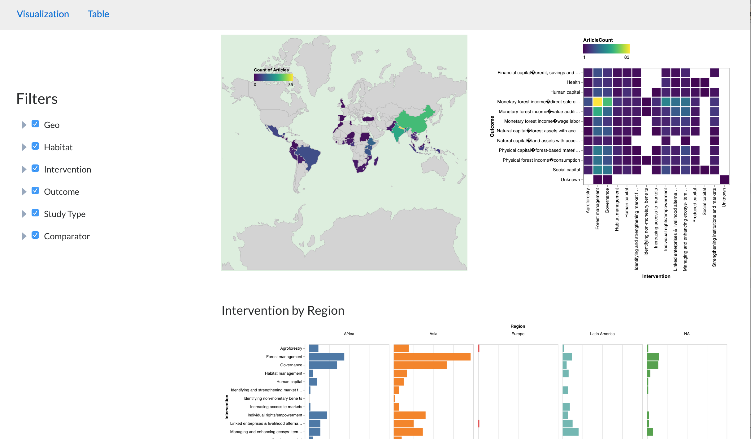 The evidence map indicates a heavy geographic bias in study effort - 35% of studies were conducted in China, Nepal and India. In comparison, fewer studies focused on South America, Western Africa, North America, Oceania and Europe. Studies ranged in robustness and design, with the majority employing non-experimental designs (68%), followed by 17% quasi-experimental, 9% impact evaluations, 1% experimental studies. Although this map is not intended to provide information on what works or what is successful, this map clearly reports that the evidence base for nature-people linkages is growing despite considerable geographic, biome and study biases - with more intangible outcomes relatively little studied. However, there are some areas that are ready for further synthesis on the linkages through in-depth knowledge reviews to understand effectiveness and impacts.