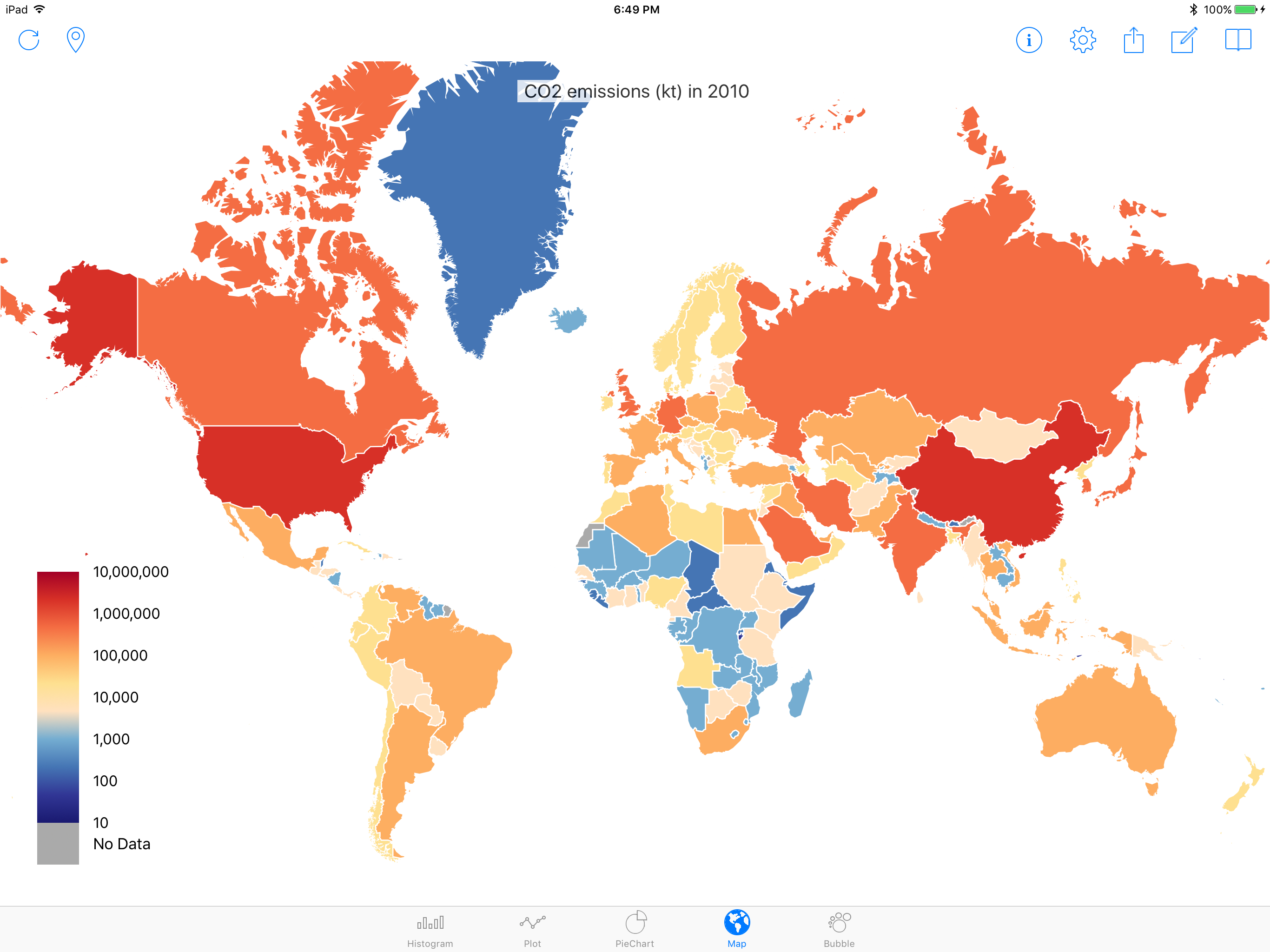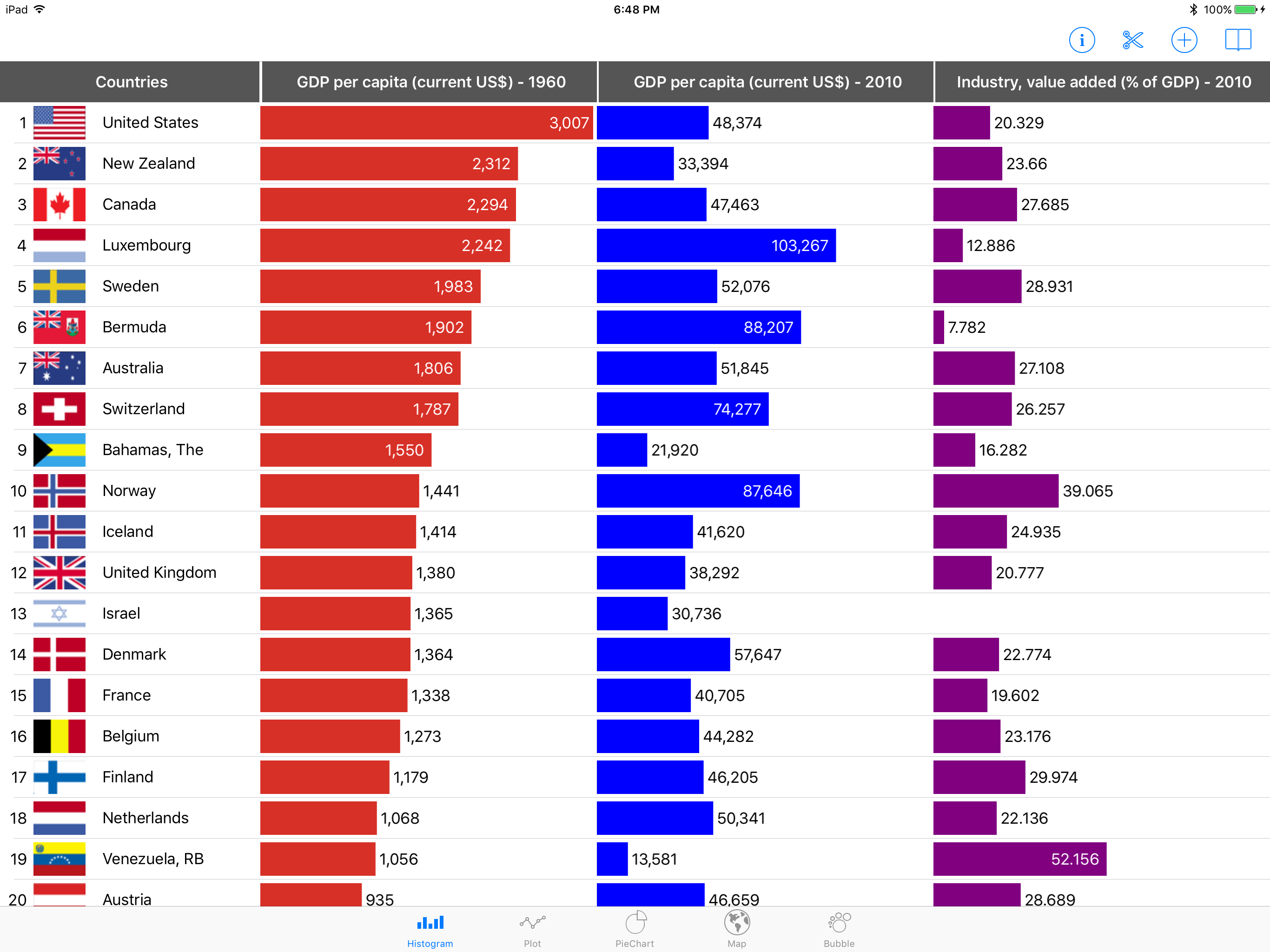 View tabular data, such as country rankings with respect to various indicators, in a big list view.