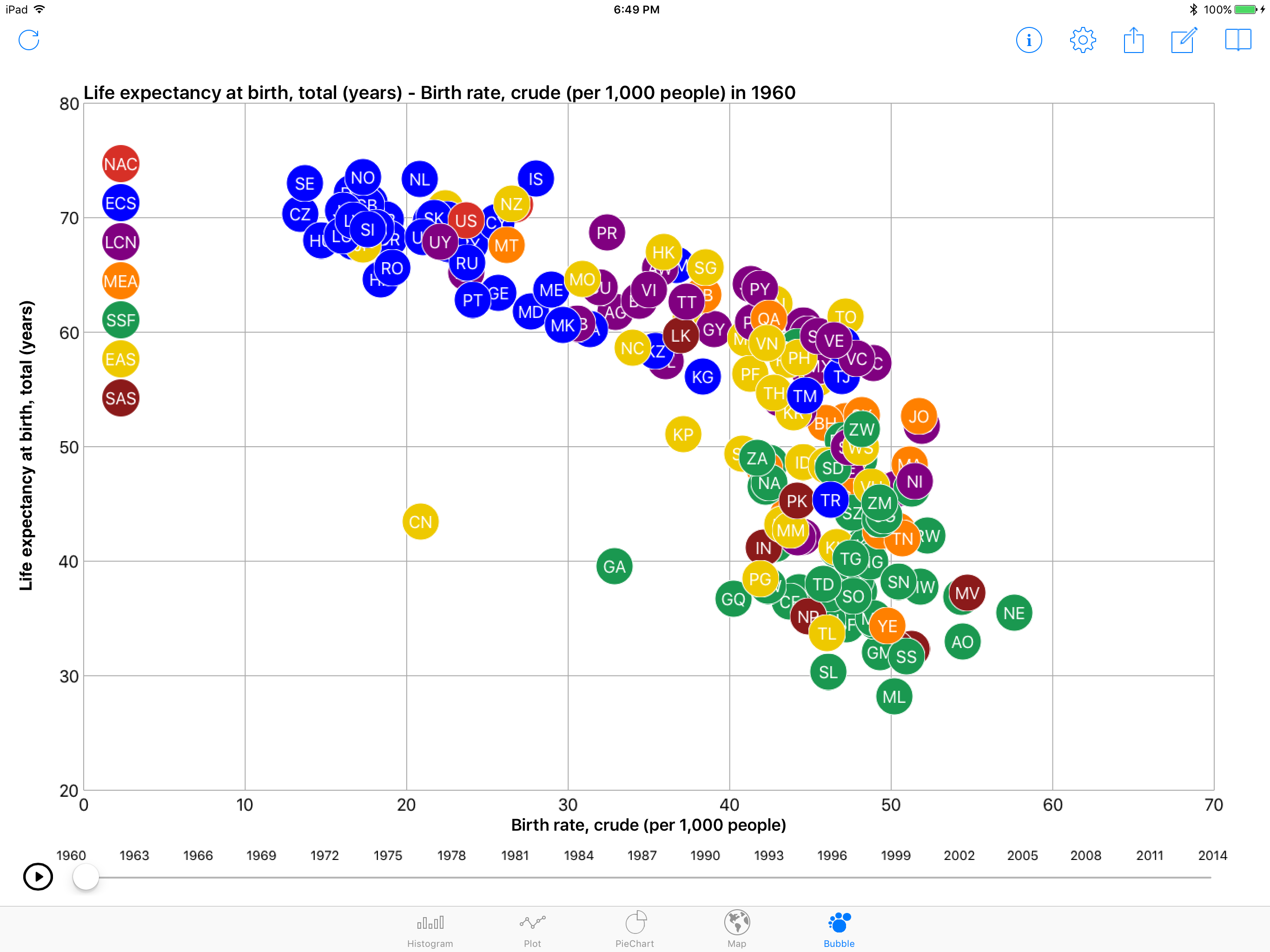 How does birth rate correlates with life expectancy for different countries from 1960 until today?