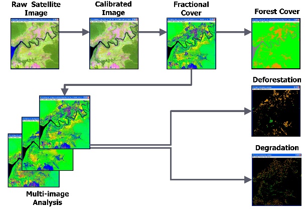 CLASLite’s automated satellite mapping approach identifies the most important components of tropical forest structure - fractional cover of vegetation canopies, dead vegetation, and bare surfaces - which further determines ecosystem composition, structure, and biomass. The program uses Automated Monte Carlo Unmixing to monitor forests with error tracking. Several stakeholders have used this software to map deforestation, carbon stocks, mining activity, and for mapping tree species (bamboo types etc.).