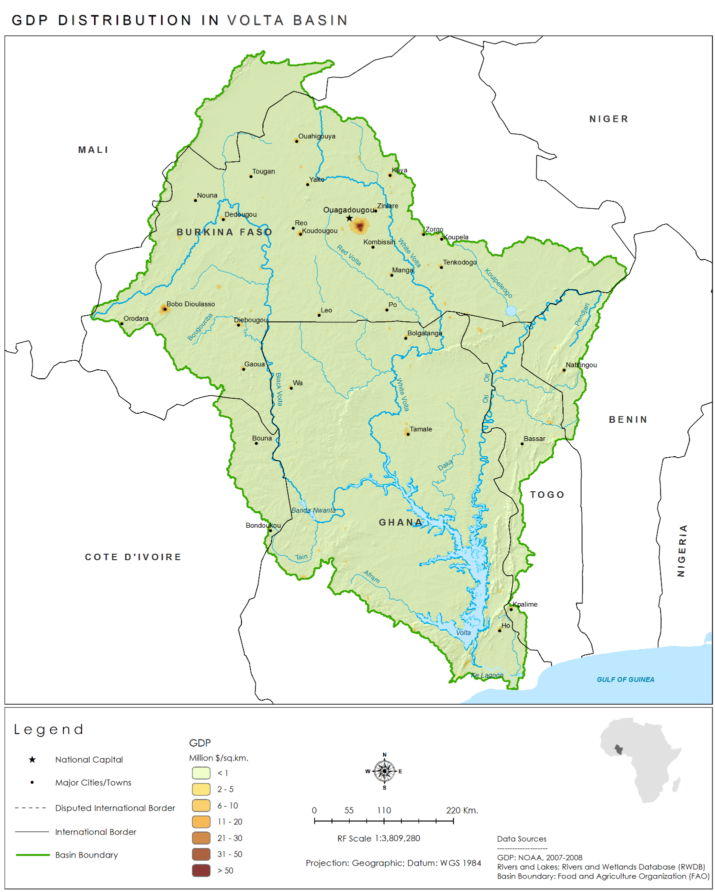 GDP is low throughout the Volta Basin, with the exception of a few urban areas.
