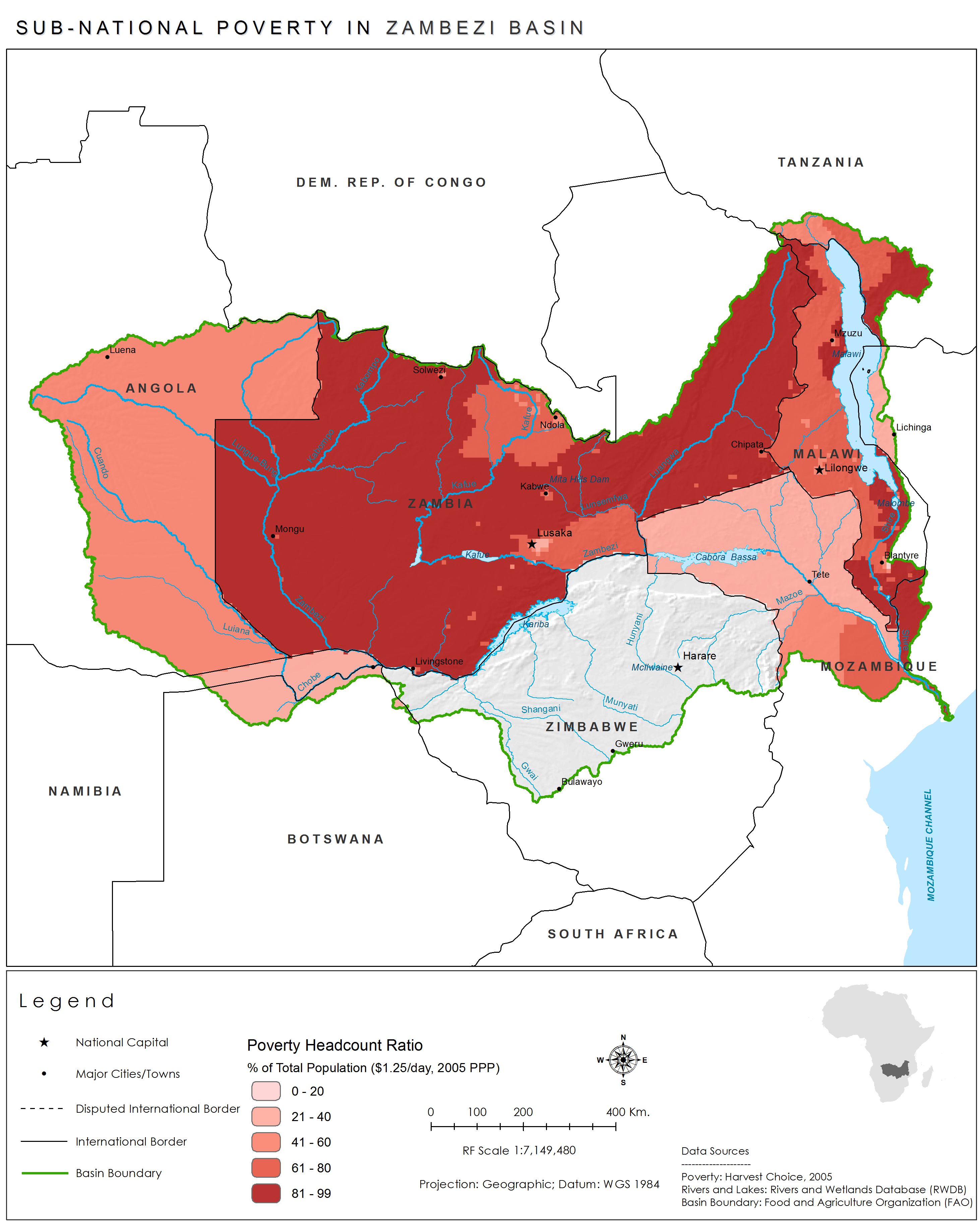 Poverty in the Zambezi Basin, measured as the percent of the population living on less than $1.25 a day, is very variable and highest in the country of Zambia.