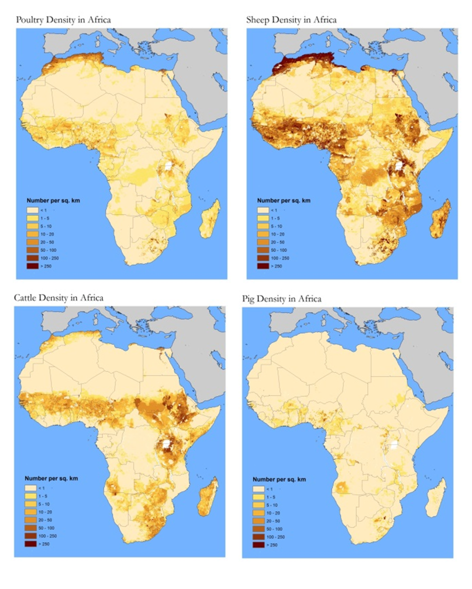 Densities of major livestock groups (poultry, sheep, cattle and pigs) in Africa.