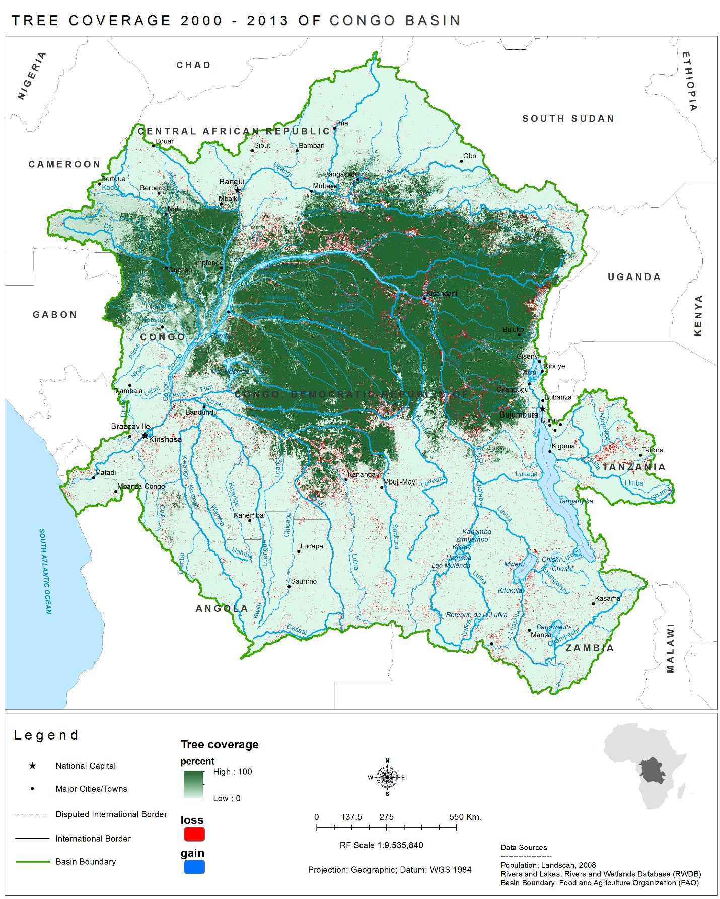 Tree coverage (2000-2013) within the Congo Basin shows much forest loss.