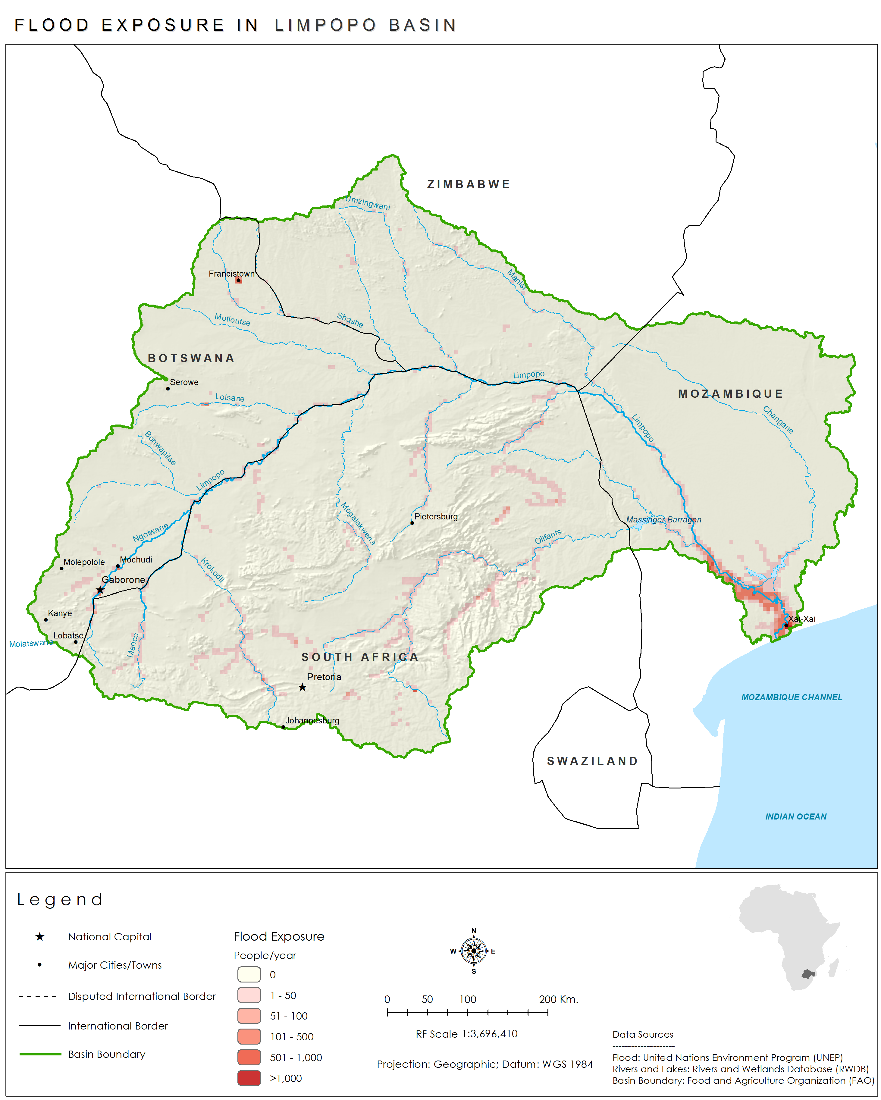 Flood exposure is highest along the Limpopo River in Mozambique.