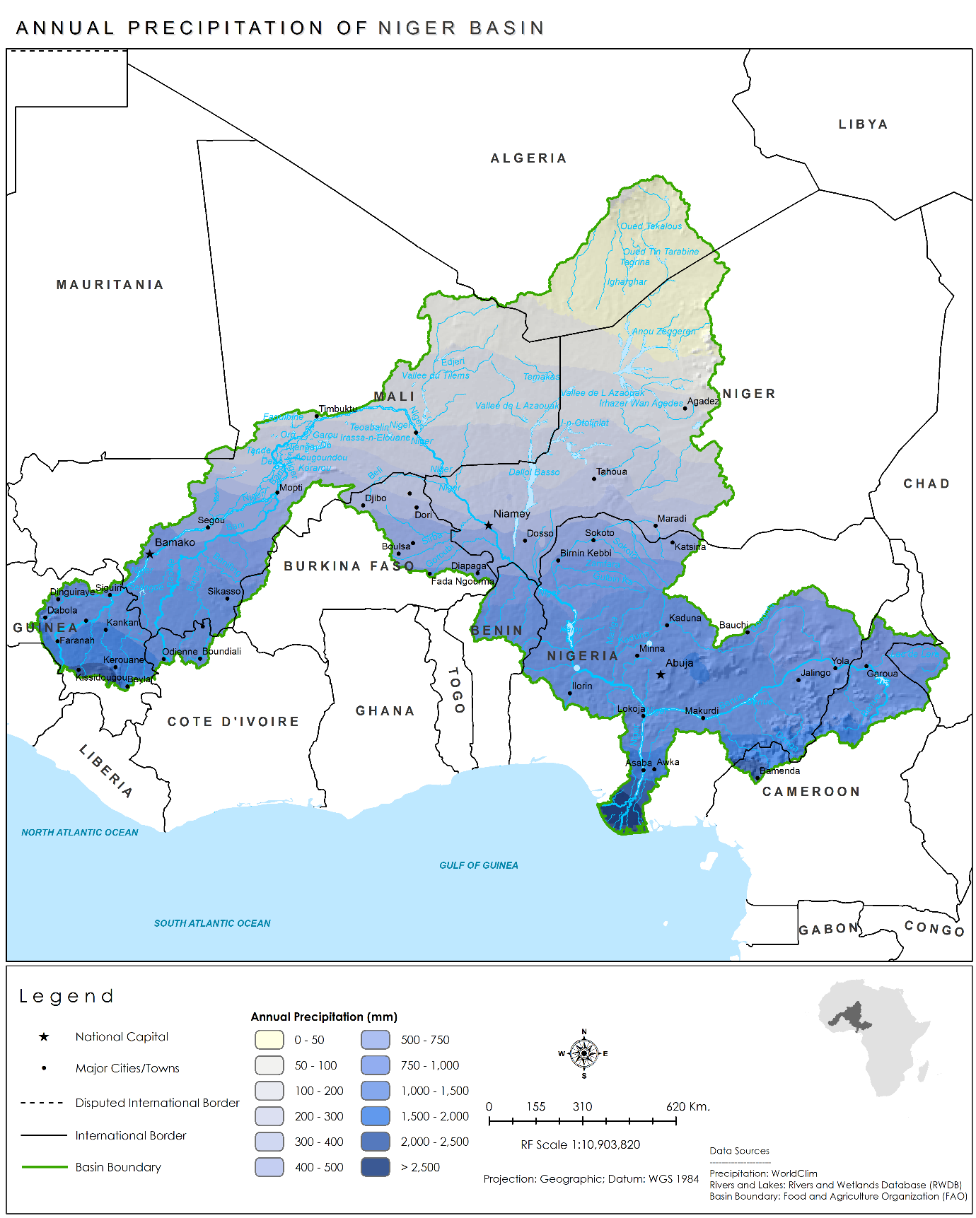 Average annual precipitation within the Niger Basin varies, with more precipitation in the southern areas of the basin and much drier conditions to the north.