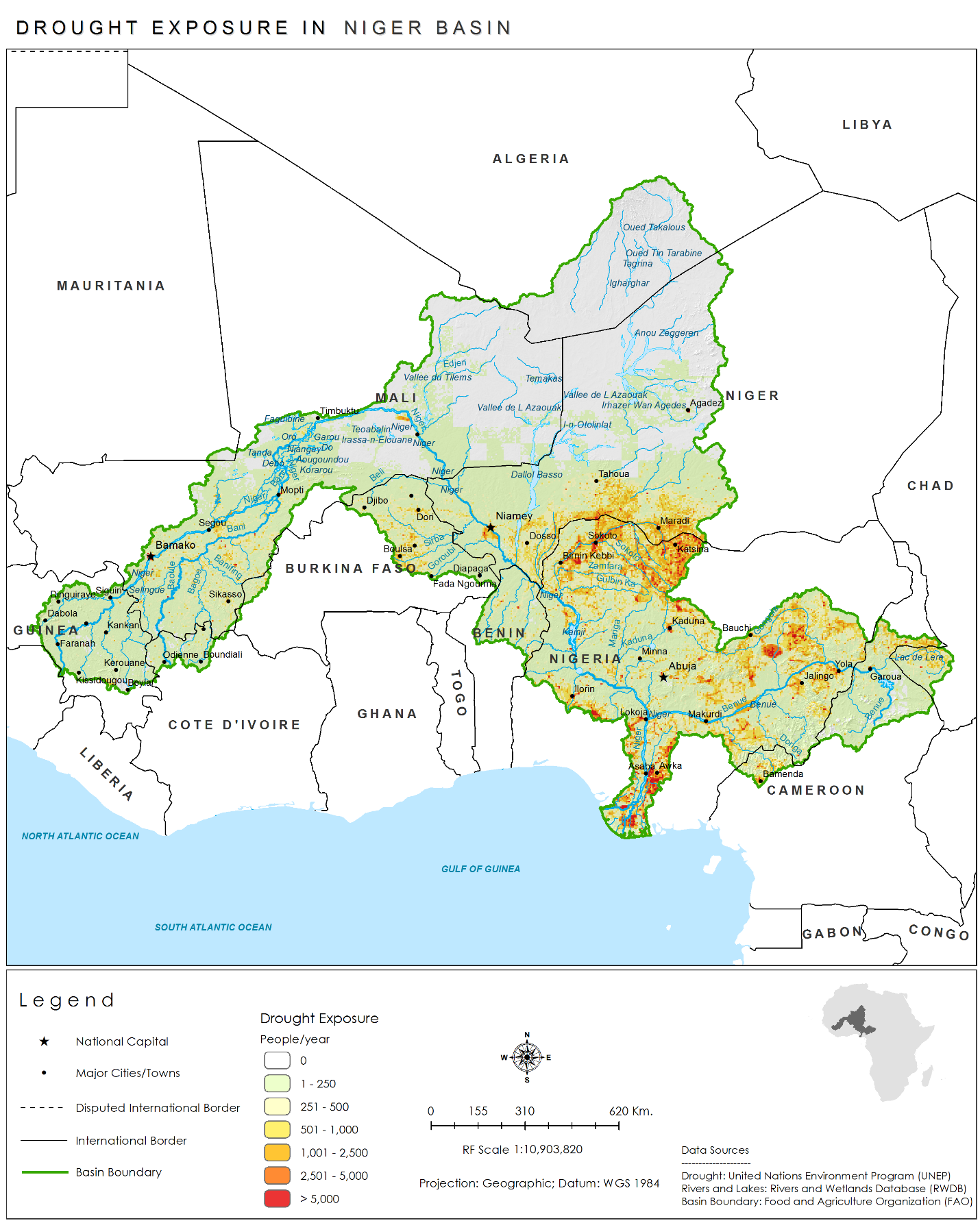 Drought exposure within the Niger Basin is highest in the Eastern portion of the basin, especially within Nigeria.