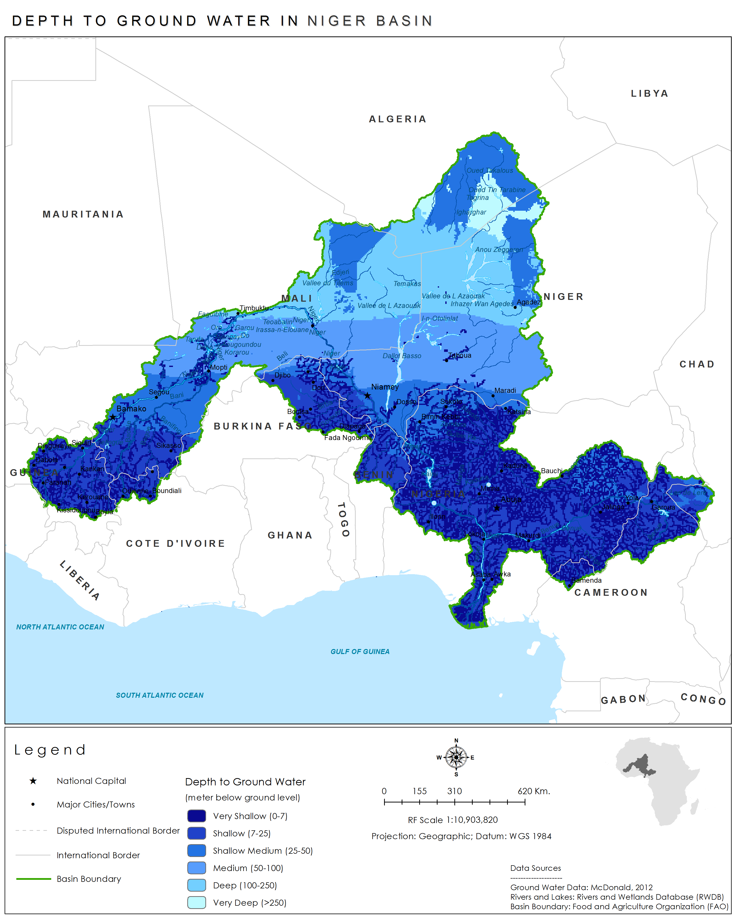 Depth to groundwater (meters below ground level) also varies in the Niger Basin.