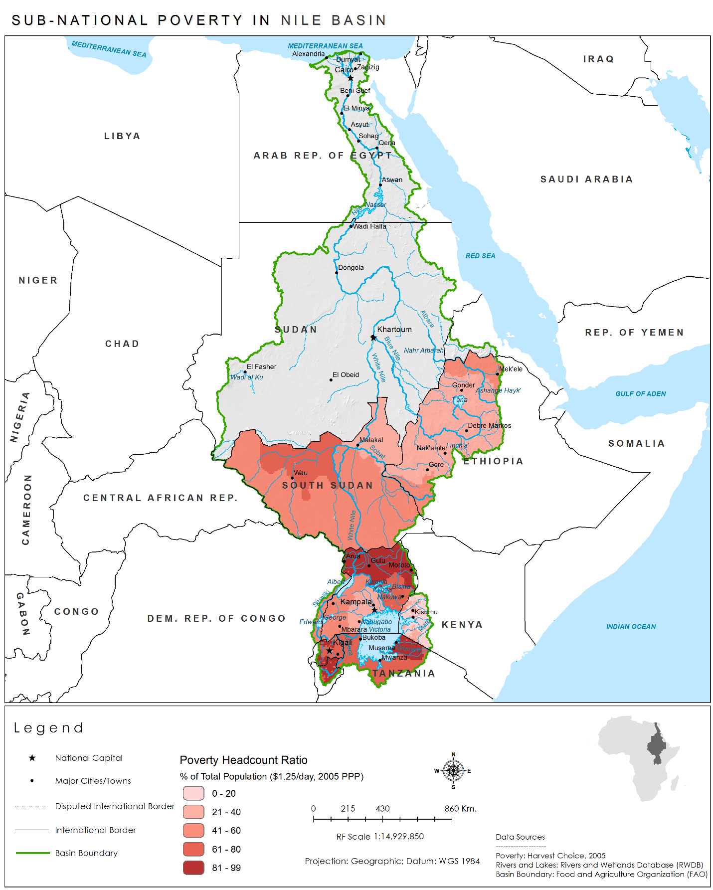 The Nile Basin exhibits a significant degree of impoverishment, as measured by the percentage of the total population living on less than $1.25/day.