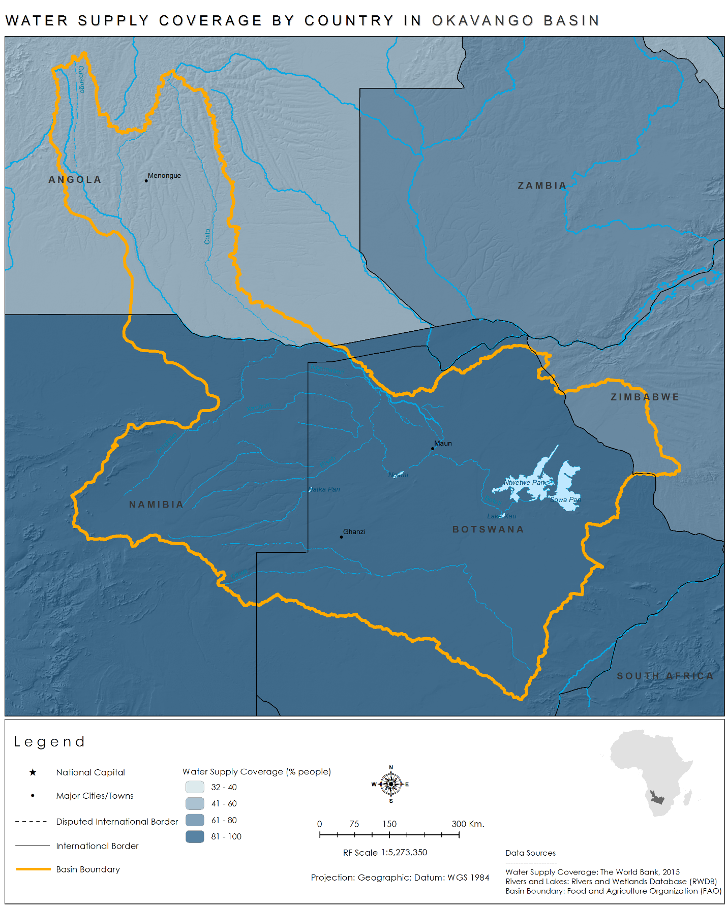 Water supply coverage within the Okavango Basin is highest in Namibia and Botswana.