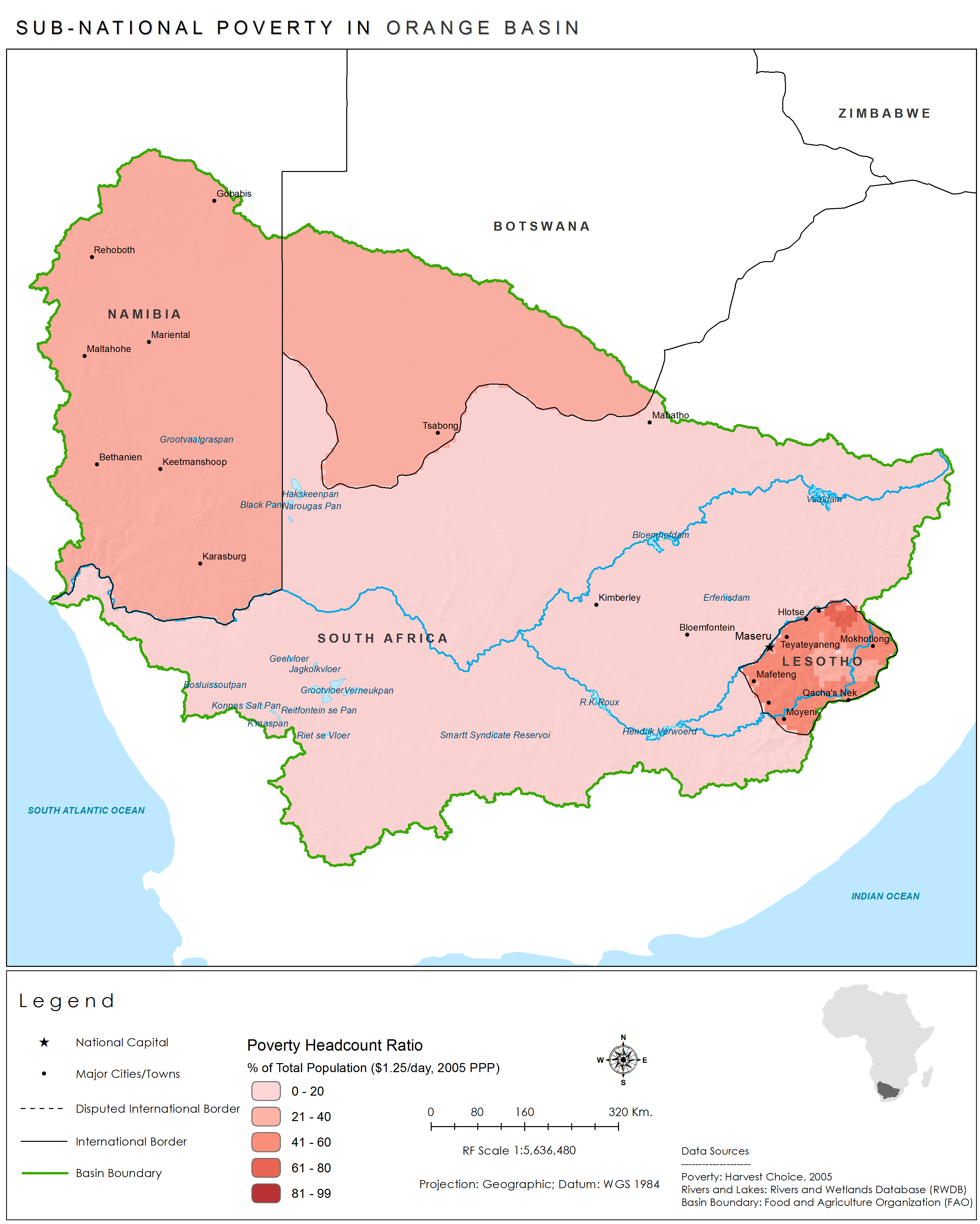 Poverty within the Orange Basin, measured as the percent of the population living on less than $1.25 a day, is lowest in South Africa and higher in Botswana, Lesotho, and Namibia.