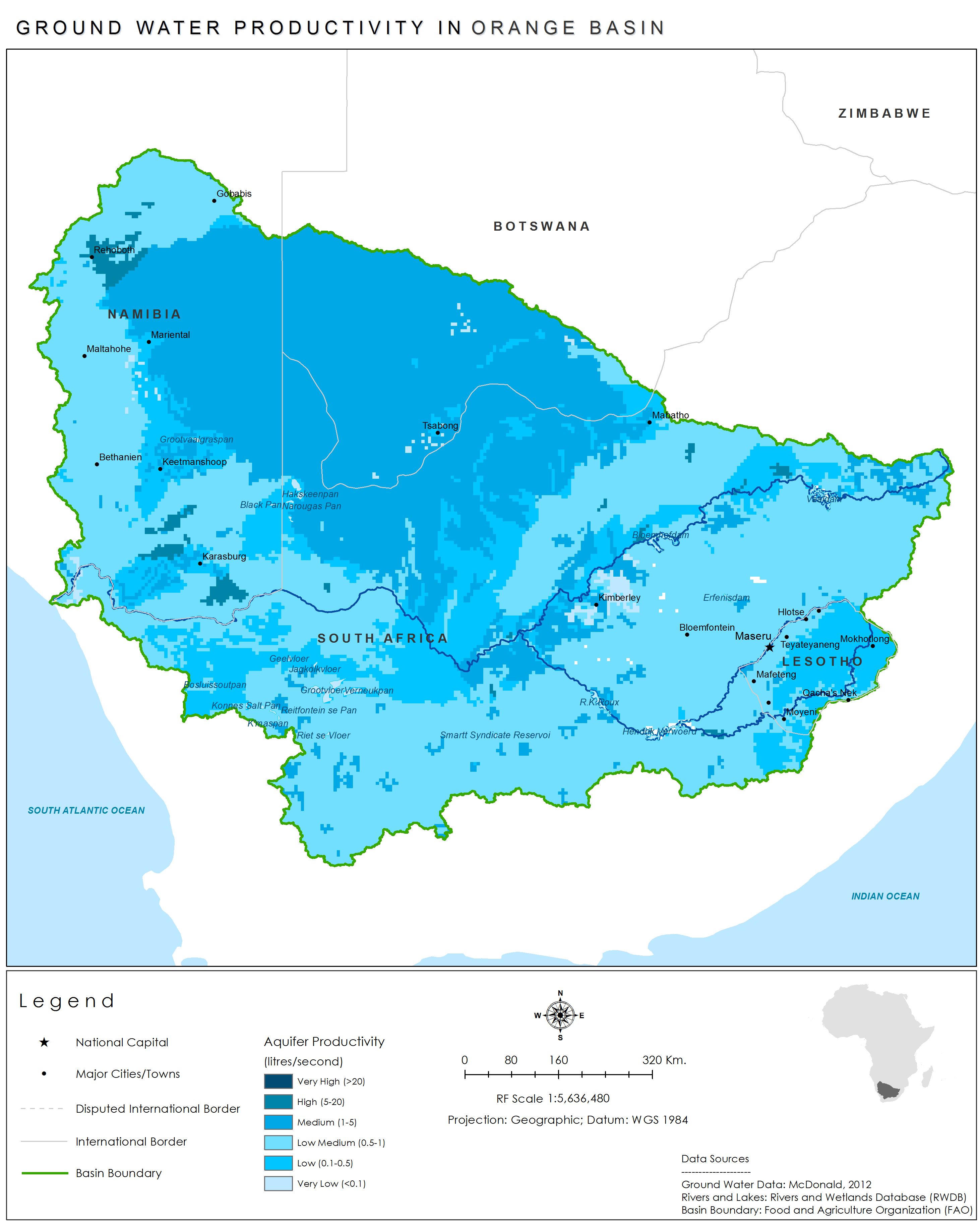Groundwater productivity is higher in the southern extent of the Orange Basin.