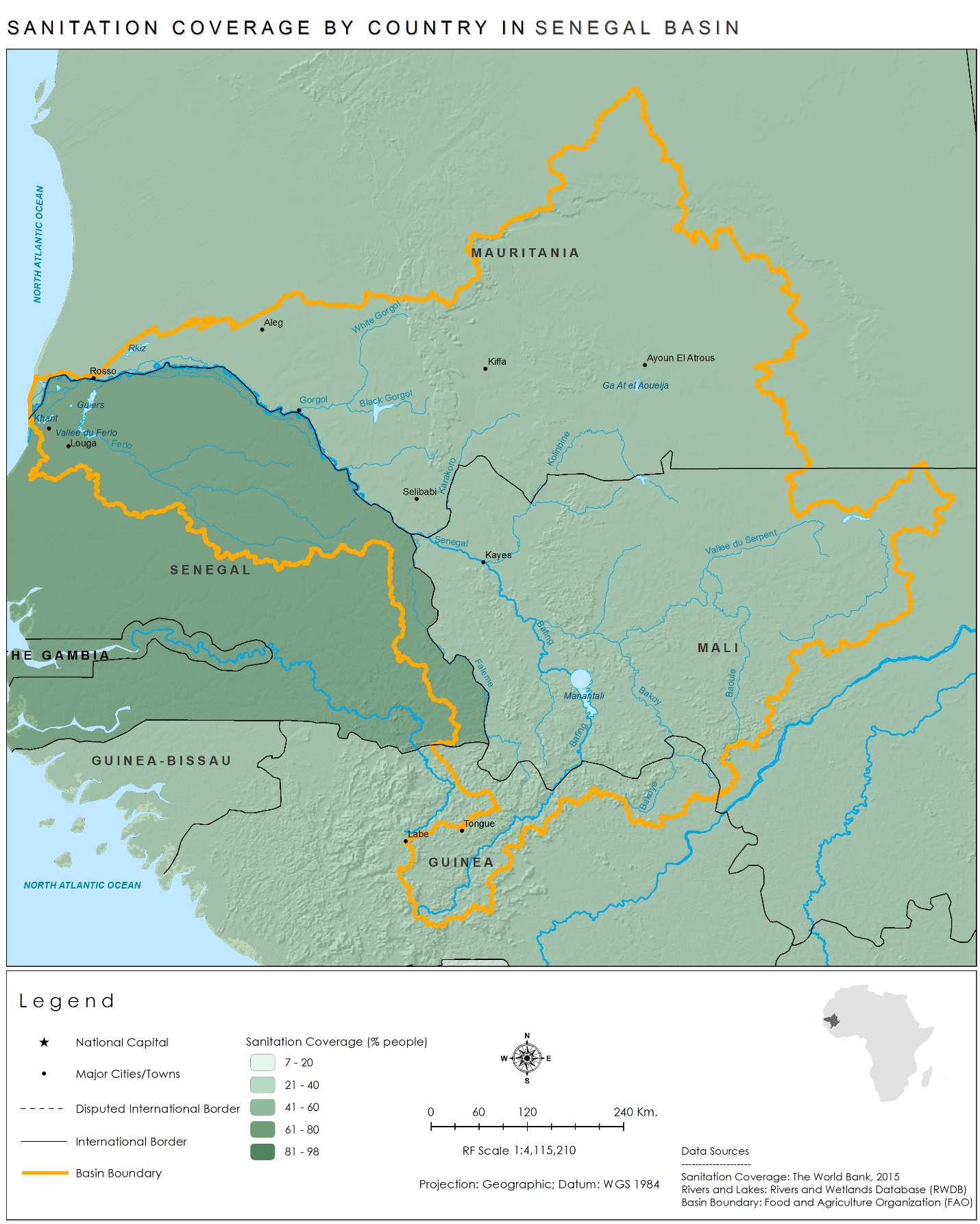Sanitation coverage in the Senegal Basin is highest in Senegal.